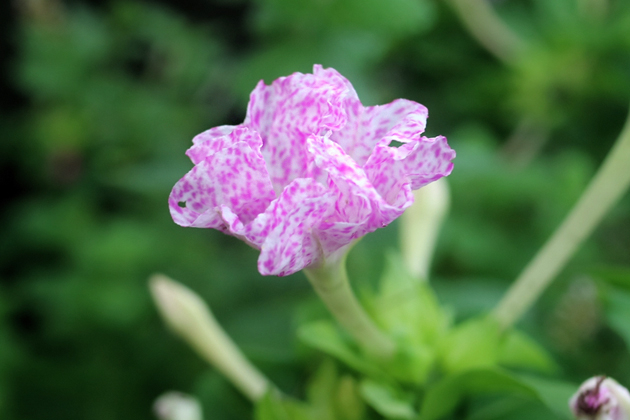 フタエオシロイバナ(二重白粉花)Mirabilis jalapa ver. dichlamydomorpha(変種名ディクラミドモルファ)。1931年に牧野富太郎博士は、この品種を東京の街頭で見つけて学名を付けました。このフタエオシロイバナは現在、変種ではなく、品種としてMirabilis jalapa f. dichlamydomorphaとされています。
