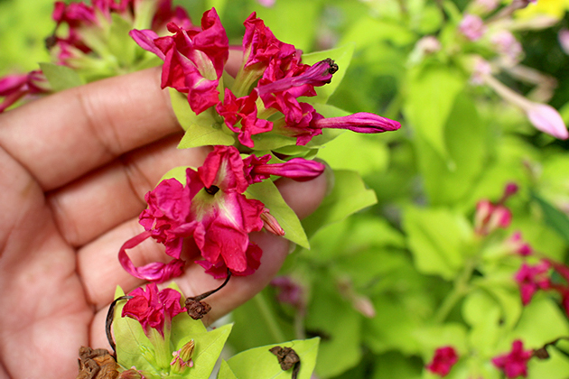フタエオシロイバナの変種名のdichlamydomorphaは、「di(二つ)」+「chlamydo(がいとう、苞 ほう)」+「morpha(形)」で構成された合成語で、「二重の苞を持つこと」を表します。通常のオシロイバナは短命で夕方から朝までしか咲きませんが、この形態はより長く楽しめるのです。