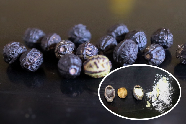オシロイバナは、ありふれた園芸植物と思われがちですが、まだまだそのプロフィールは語り尽くせません。漢字で書くと「白粉花」です。その果実は黒く、この中には褐色の種皮に包まれた種子が一つ入っています。種子をつぶすとでんぷんが豊富にあり、まるで「白粉(おしろい)」のようです。それが、オシロイバナという名前の元ですが、昔から本当に白粉の原料の一つにしていました。