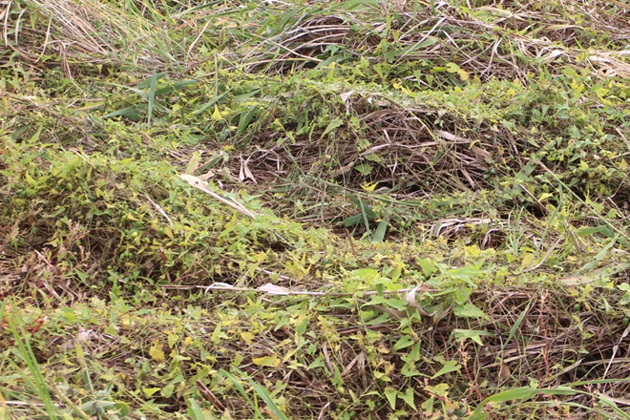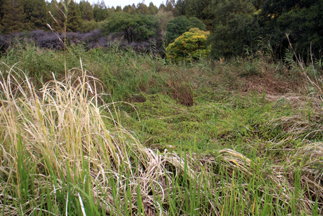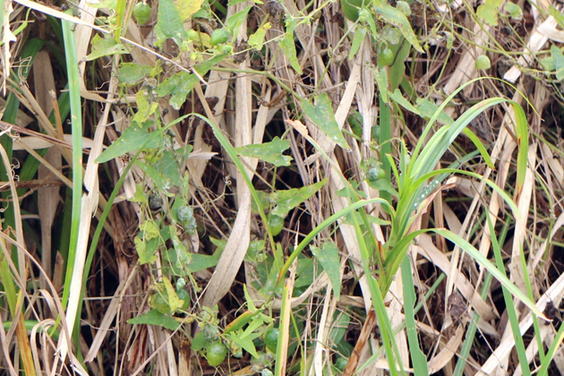 ため池の周りには大小の湿地があって、アシやガマも生えています。湿地は、水浸しで中に入ることはできませんが、そんな中央部に何やらツル性の植物が生い茂っているのが目に留まりました。