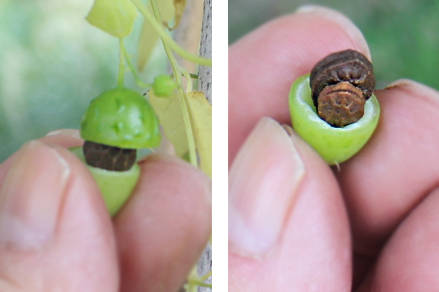 ゴキヅルの果実は、下垂して大きさは長さ2cm、幅1.2cmほど。上と下に割れるようになっていて、お茶碗とその蓋のようになっているのです。上蓋は色が濃く、イボ状の突起があります。下部分はつるつるしていて、装飾がありません。