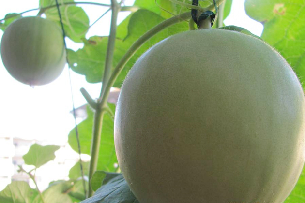 定植後30日。雌花の1番花を確認して交配しましたが、受精は確認できませんでした。5日後に咲いた2番花、3番花に交配して受精を確認しました。メロンの雌花は小さいので注意深く観察しましょう。