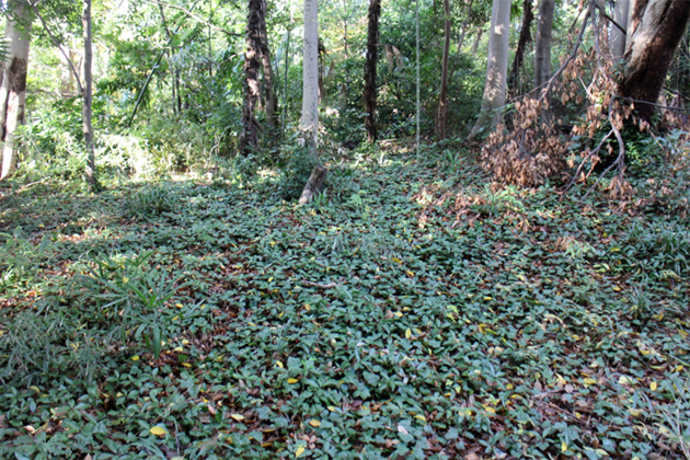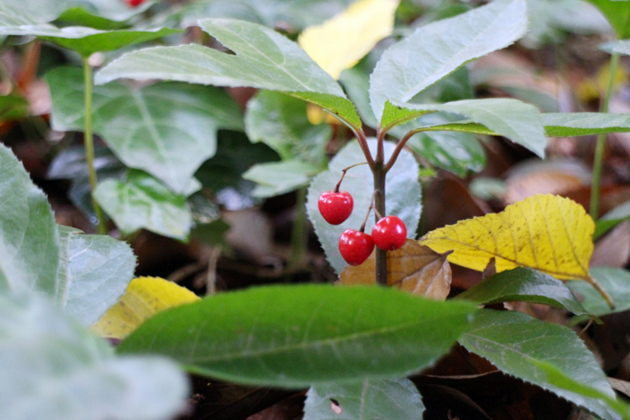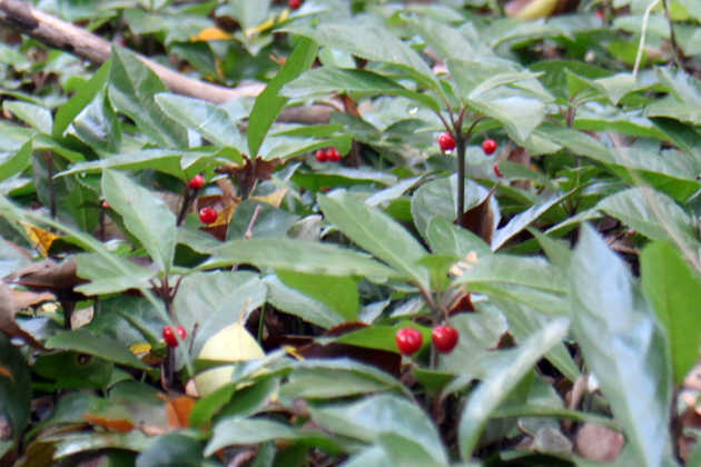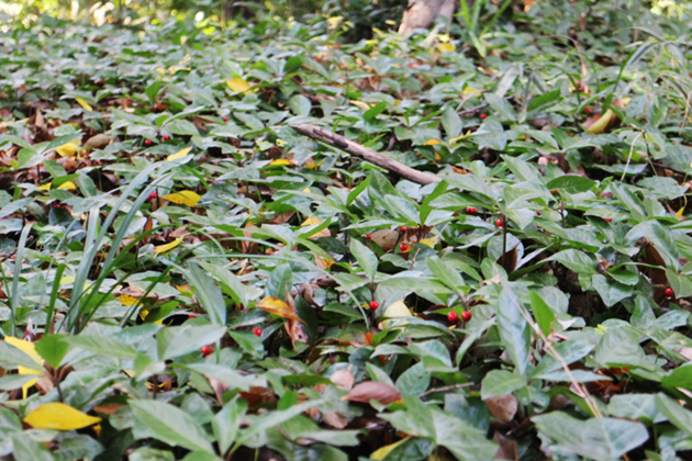 地面を緑のじゅうたんのように覆うのは、常緑小低木であるヤブコウジです。
