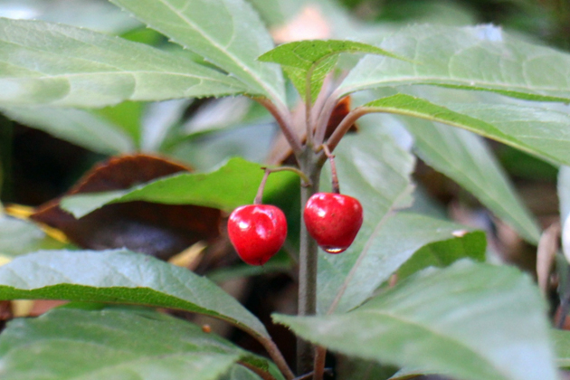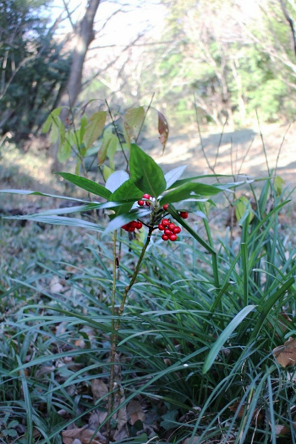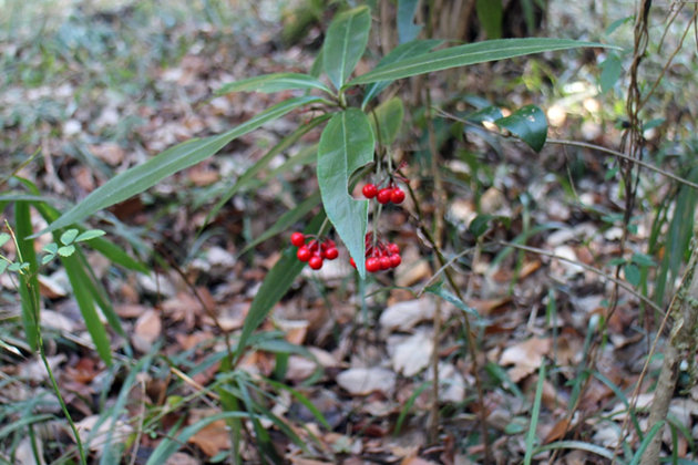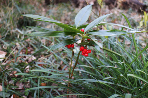 この土に埋もれた地下茎によりある程度の耐寒性を持ち合わせ、背の低い植物体と相まって、落ち葉に保護され寒さに耐えられました。ヤブコウジは、こうした性質を獲得して熱帯起源のご先祖さまを持ちながら、北海道の北緯44度付近にも分布を広げたヤブコウジ属の北限分布種なのです。