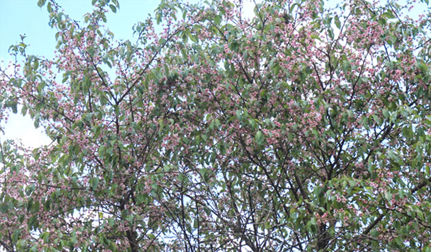 日本から同行した植物博士は「ヒマラヤザクラではないか?」と言うのです。しかし、私の知っているヒマラヤザクラと花弁の形状、花色、がく片の色が異なります。さらに開花習性も異なり、春(3月15日)に咲いていました。