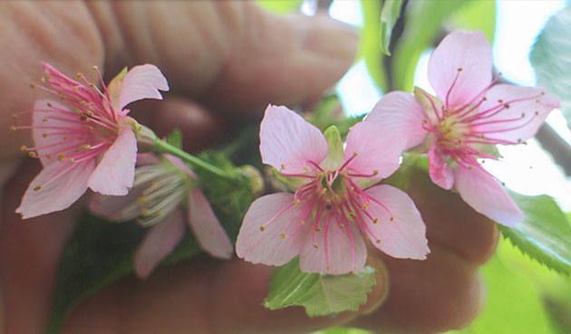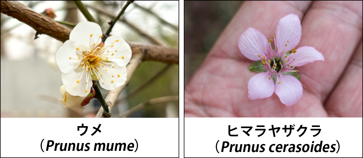ヒマラヤザクラを手に取ってみると、私たちが知っているサクラと花の咲き方が違うことに気が付きました。この咲き方は、ウメ(Prunus mume)に似ているように思います。