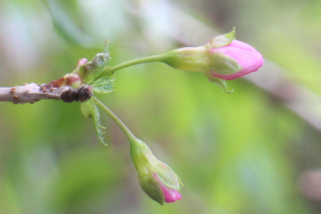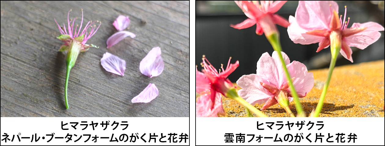 サクラを鑑別するのに、花形やがく片の形状もポイントの一つになります。ヒマラヤザクラの二つのフォームを観察すると、がく片の形状と色が違います。ネパール・ブータンフォームのがく片は、薄い緑色で皮膜状、短形であるのに対し、雲南フォームのがく片は、赤く厚みがあるのです。この赤いがく片にはきっと何かしらの理由があるはずです。花弁の形が違うのも気になります。