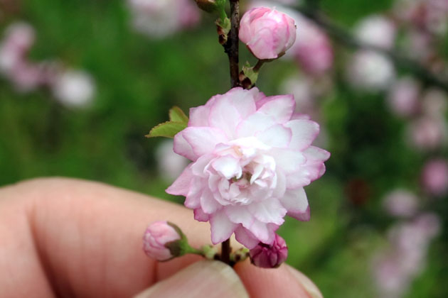 上の写真は、そのニワザクラから作出された八重咲きの園芸種です。この種は、日本でも栽培されていますが、高温多湿の気候はあまり好まないため、病気になりやすく、どうも居心地が悪そうです。