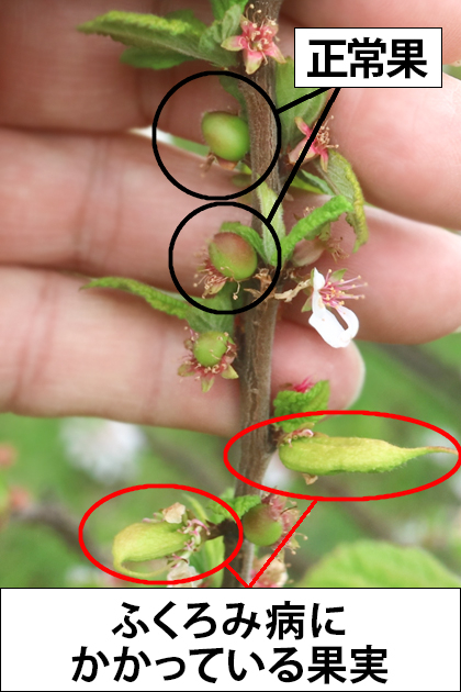 ユスラウメは、丸くて小さな梅状の果実を付けるのですが、ときに実がさや状に膨らむ現象が見られます。原因は、カビによる「ふくろみ病」という症状です。ふくろみ病は、殺菌剤の散布や風通りをよくするための剪定(せんてい)を行うなど、日ごろの予防が肝心です。