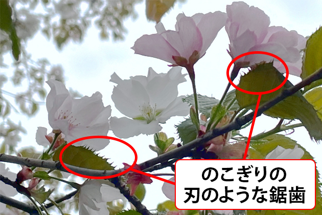 シナヤマザクラ(またはシナミザクラ、支那実桜)Prunus serrulata(プルヌス セルラータ)バラ科サクラ属。種形容語のserrulataは、ラテン語で「小さなノコギリ」を意味し、葉の縁に見られる鋸歯(きょし)に由来しています。上の写真からも、その葉のギザギザした縁の様子が分かると思います。