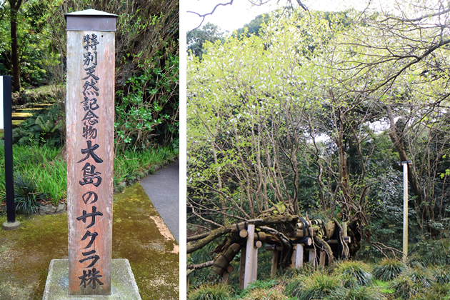現在、伊豆大島の泉津地区には、推定樹齢800年以上とされるオオシマザクラの古木が、国の天然記念物として保存されています。かつては大島近海を航行する船からもその姿が見えたと伝えられるほどの巨木でしたが、主幹はすでに枯れ、現在は倒れた枝が地面に根を張った「ひこばえ(孫生え)」が生き残っています。
