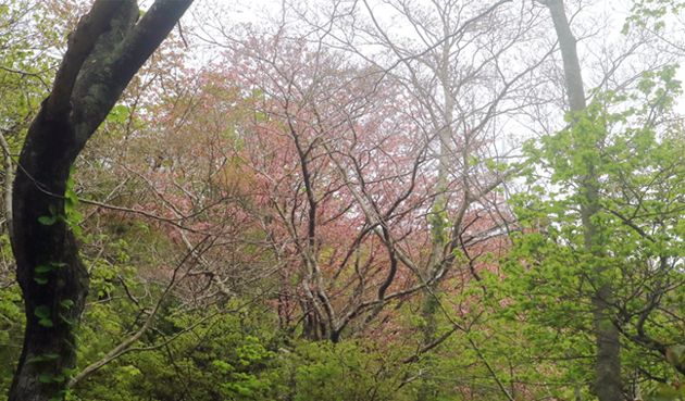 5月にこの山に登り、森の中に赤い花を咲かせるサクラを見つけました。
