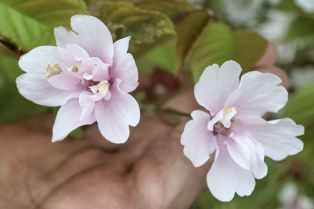オオシマザクラの開花の終わりに中心部が赤くなること、がく片に明瞭な鋸歯、花被の毛を持つ個体が存在すること、そして、多弁化の因子を持つこと――。これらの特徴を勘案するならば、私のこの仮説も、まんざら否定できるものではないように思うのです。