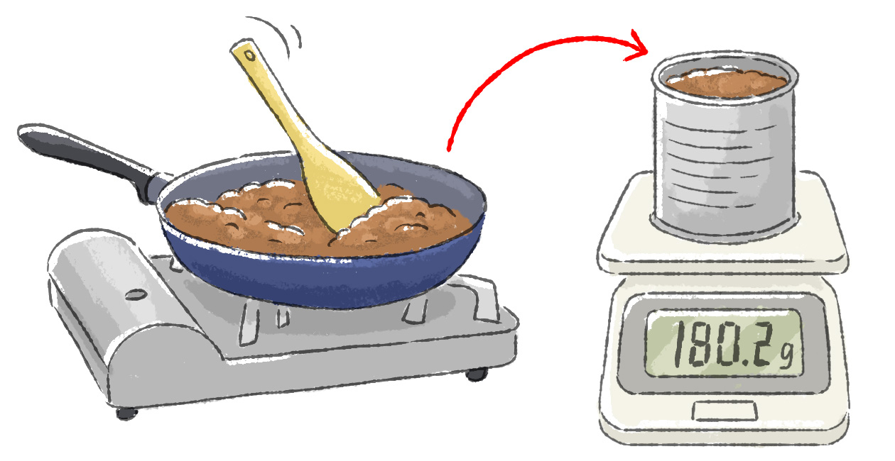 3. フライパンに土を入れ、弱火でじっくりとカラカラになるまで炒る。炒った土の重さ(乾いた土の重量)をデジタル計で量る。