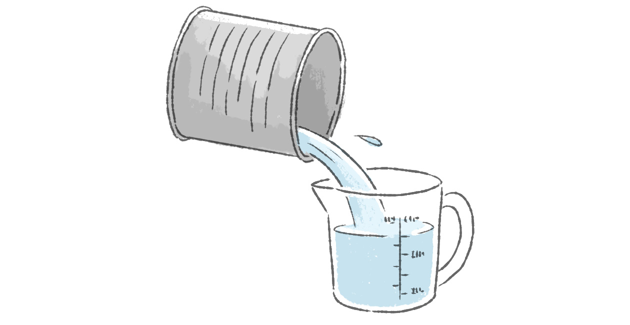 4. 1.で使った容器に水を入れ、その水を計量カップに移して容積を量る。