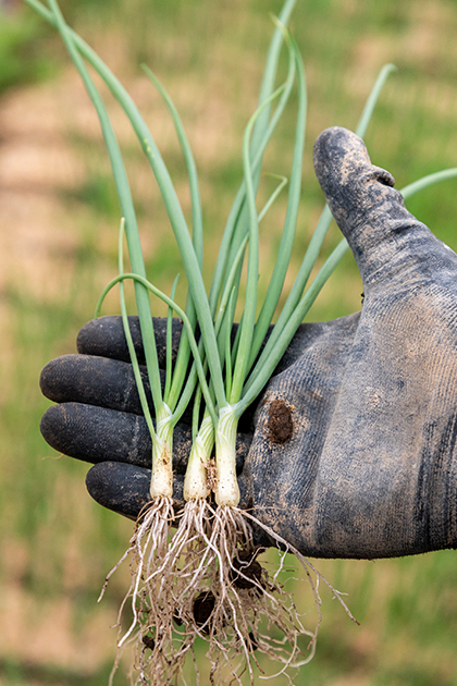 かといって、細過ぎる苗は寒さに耐えられず枯死してしまう危険もあります。そこでおすすめなのが、タマネギの細い苗を2本一緒に植える方法。2本一緒だと凍霜害で枯死しづらく、Lサイズの玉にはなりませんが、Mサイズほどの玉が1カ所当たり2個収穫できるのでお得だと思います。