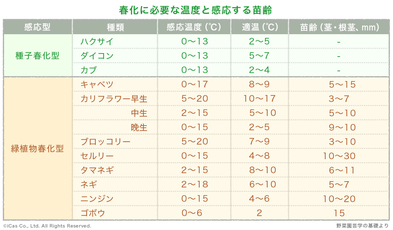 もう一つの春化が、「緑植物春化型(グリーンプラント・バーナリゼーション)」。こちらは植物が一定の大きさになってから、低温に感応するタイプです。代表的なものがタマネギ、キャベツ、ブロッコリー、ニンジンなど。例えば、タマネギは鉛筆くらいの太さの苗を植えることが、最大の栽培のコツです。大きくて立派な“よい苗”に見えるものほど、早くとう立ちしてしまう確率がグッと上がります。