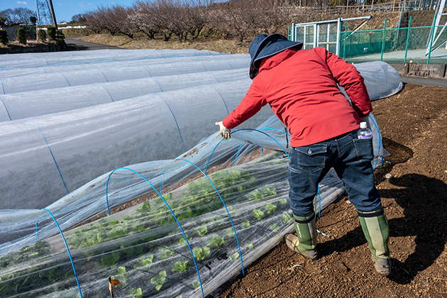 また、トンネル内部は、野菜に不織布をふわっとベタ掛けをします。この1枚があるおかげで地温が保たれ、放射冷却による明け方の冷え込みを防げます。近年は、冬でも暖かかったり、急激に冷え込んだり……と天候が予想できず、資材の選択も難しくなっています。気候の変化に柔軟に対応できるよう、備えておく必要があると感じています。