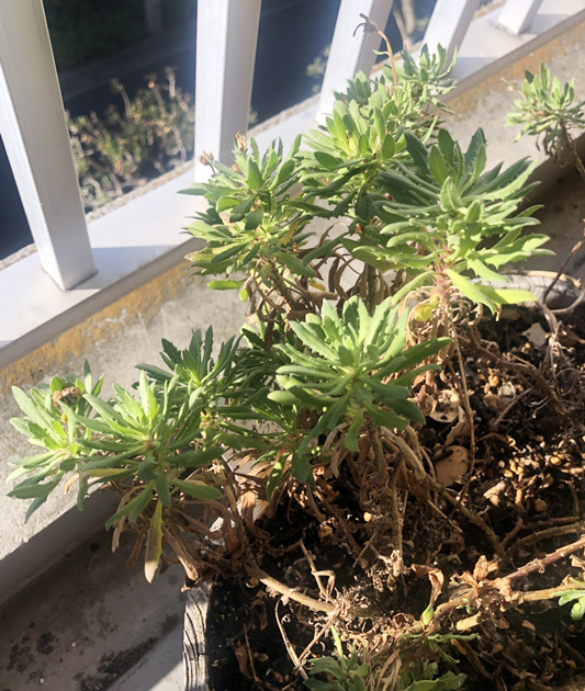 2025年の冬は生暖かい風が吹く日もあったので、編集部スタッフが自宅で育てているオステオスペルマムは、株元が茶色ですが、葉は青々としています。