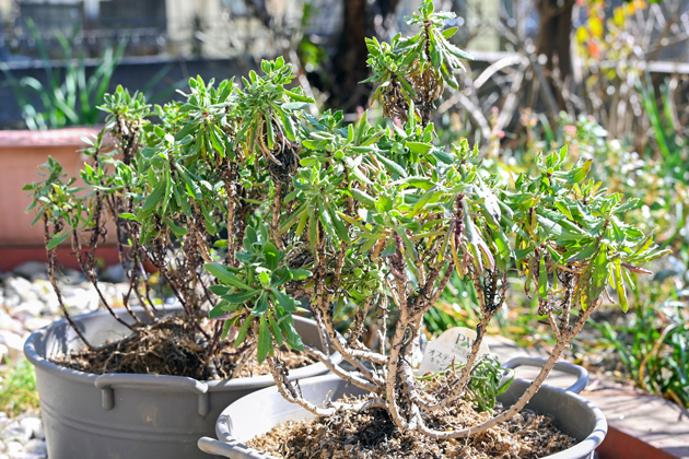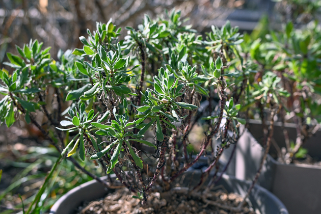 冬場に整えるなら、ポキッと折れてしまうような、活動していない枝や茎を整える程度で、判断が不安な方は触らない方が株の体力を温存できるとのこと。人の心配なんてなんのその、芽吹くかと不安になって、枝を触ってしまうと余計にストレスを与えてしまうそうです。放っておくのも愛情なんですね。