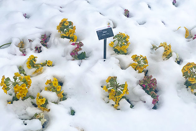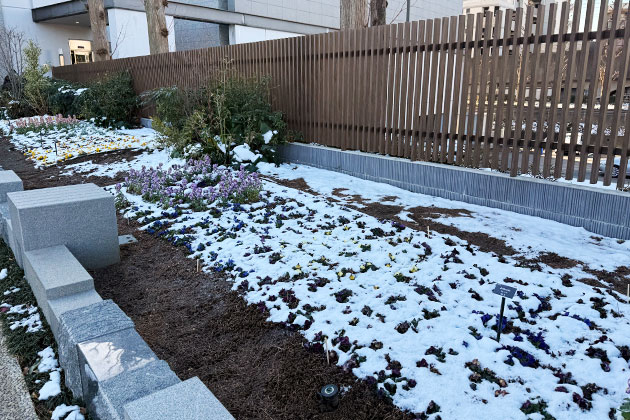関東・都市部でも、年に数回は雪が積もることがあります。足元を見ると花々が凍えながらも耐えていました。