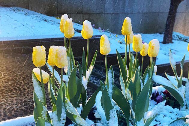 アイスチューリップが見ごろを迎えた2月5日に雪が降りました。
