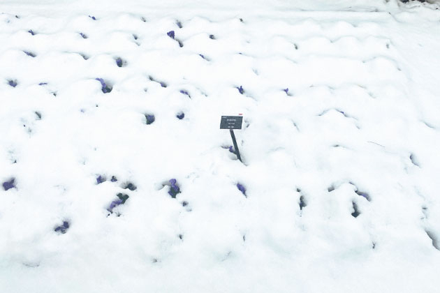 無理やり雪を取り除くと凍っている茎が折れたり、株が傷んだりする原因にもなるので、そのまま雪解けを待ちます。