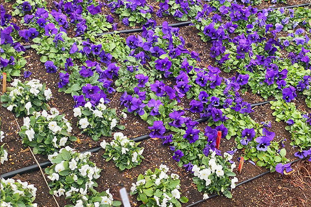 この日の写真に写っている「よく咲くスミレ パイナップル」、「ピエナ ホワイト」、「よく咲くスミレ ラムレーズン」が並ぶエリアを観察しました。