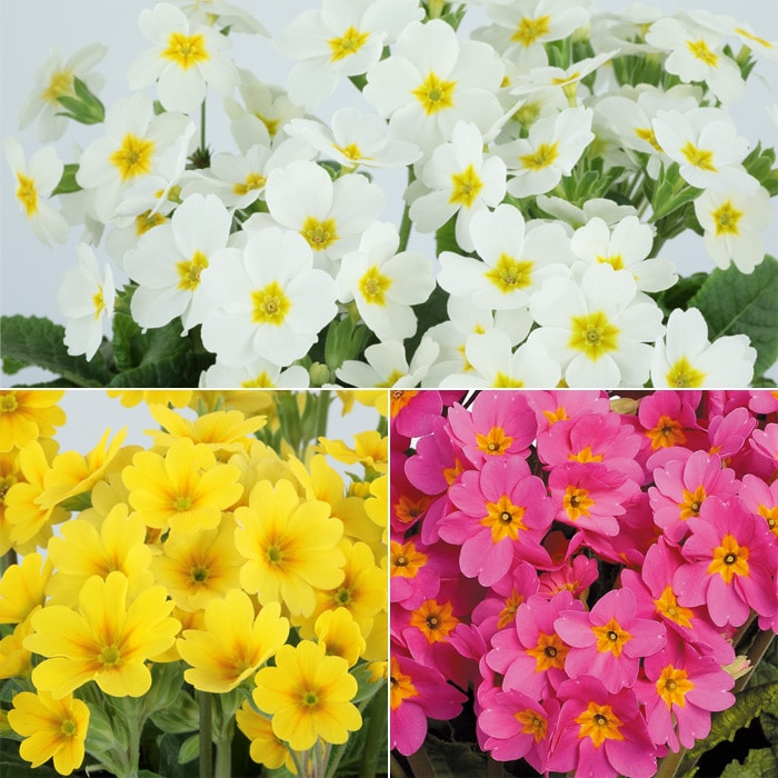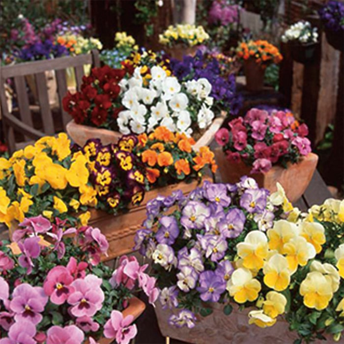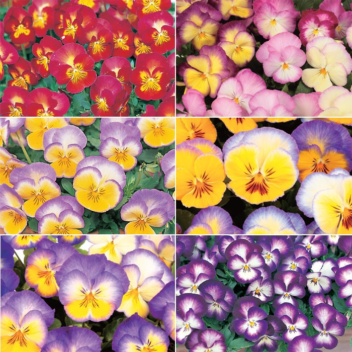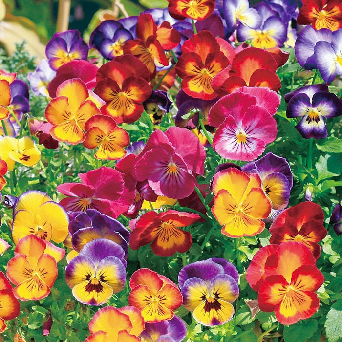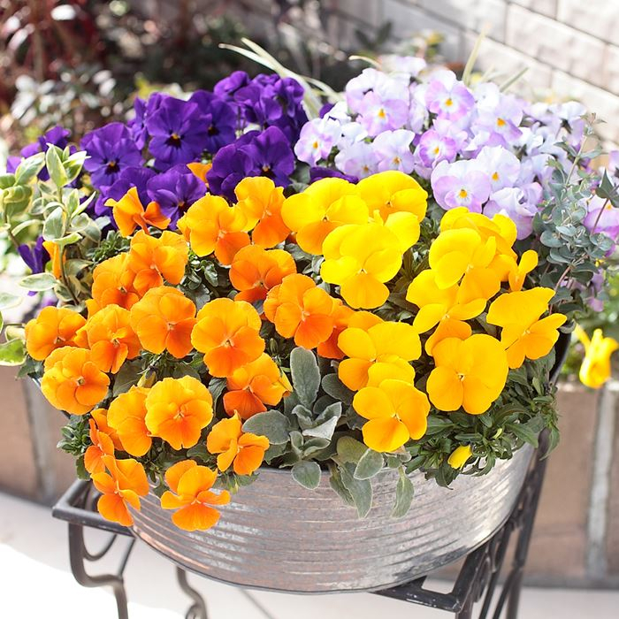 手前からプリムラ「アラカルトシュシュ」、パンジー「虹色スミレ」、ビオラ「ピエナ」、パンジー「よく咲くスミレ」が咲いています。