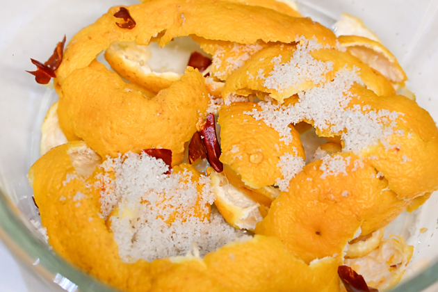 ユズ皮の重量に対して15~20%の塩と、乾燥「羅辛」を合わせます。