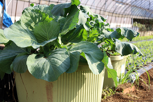 チンゲンサイ「武帝」もいいですね。農作業ってとにかく忙しいから、どうしても植え付け時期が適期より遅れてしまうときがあります。そうなると他の品種はとう立ちするのに「武帝」は大丈夫。そして、「武帝」の根張りの強さといったらもう、株が大きくなるからいいですね。だから「武帝」だけは作付けに欠かせないですよ。