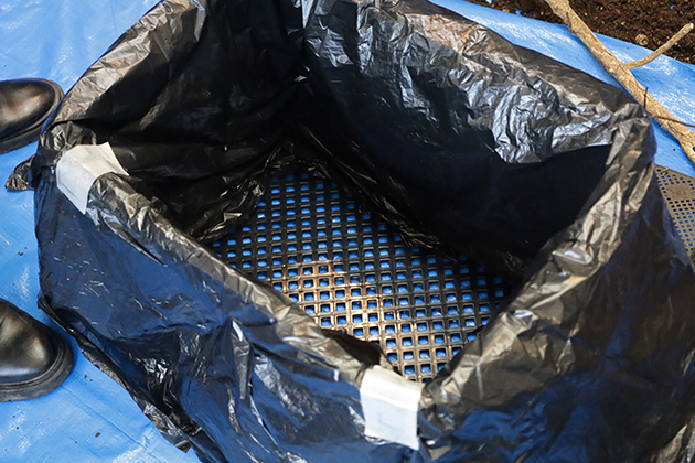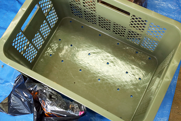 コンテナを利用する場合は、側面の穴から土がこぼれないようにビニール袋で側面だけをふさぐ。水はけと通気のため、底はふさがない。