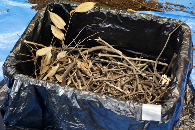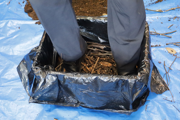 小枝を5cm程度の高さになるまで踏みつぶす。これが排水性を促し、いずれ菌ちゃんの餌にもなる。