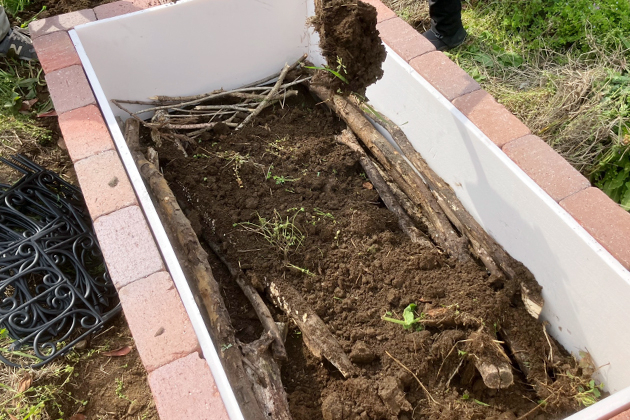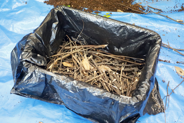 小枝をプランターやコンテナの高さの3割程度入れる。コンテナに入らない長さの小枝は折って、向きはそろえずいろいろな方向になるように敷き詰める。