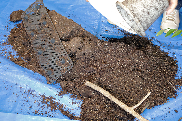 土は、使い古したプランターの土や山道の側溝にたまった土をブルーシートの上に空ける。新品の培養土などは向かないので注意する。