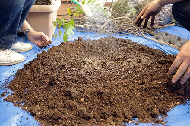 土を強く握っても水がにじまず、軽く握って崩れない程度までしっかり土をぬらして、よく混ぜる。排水性があまりよくない土は、2割程度もみ殻を加えてよく混ぜる。