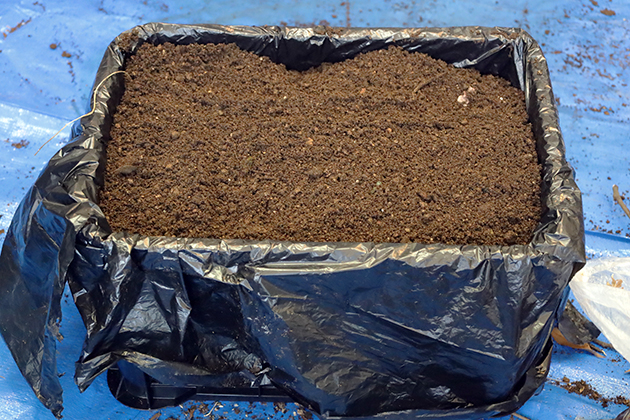 土留めの落ち葉がずれないように最初は優しく土を入れ、コンテナの9分目くらいまで土を入れる。