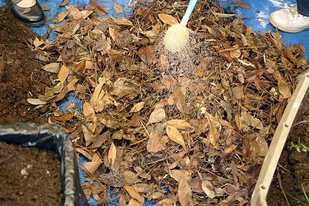 落ち葉が乾いているようなら、水でしっかりとぬらして混ぜる。落ち葉が雨に当たって十分湿っているようなら水はかけなくてよい。