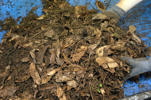 落ち葉と同量に用意した土をしっかり混ぜていく。
