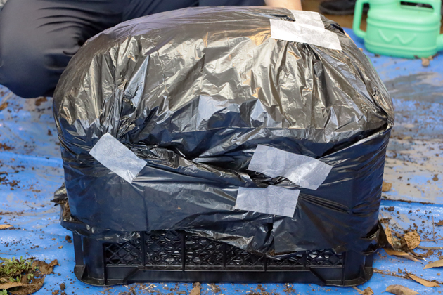 雨と日よけのため、黒いビニール袋か黒マルチで覆い、飛ばされないようにテープやひもでしっかり固定する。