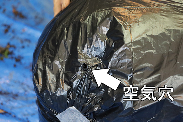 密封状態にならないように、指を使って黒マルチに空気穴を開ける。穴の大きさは親指程度の大きさで、四隅に開ける。穴が大きいと乾きやすくなるので注意する。