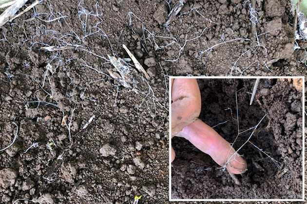 3カ月以上たったら、黒マルチを開けて中の土の様子を確認する。土表面に糸状菌がほんの少しでも見えたらOK。まだ糸状菌が見えないようなら、黒マルチを元に戻して、もう1カ月待つ。
