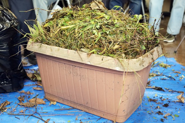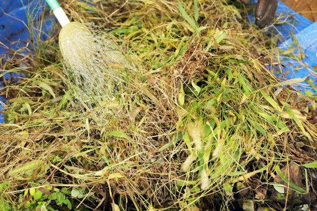 これで下準備は完了!落ち葉で仕込む場合とは異なり、マルチもせず雨ざらしで2カ月間置いておく。その間、雨が降って草がぬれているときは細菌類、乾いているときは糸状菌類が分解していく。