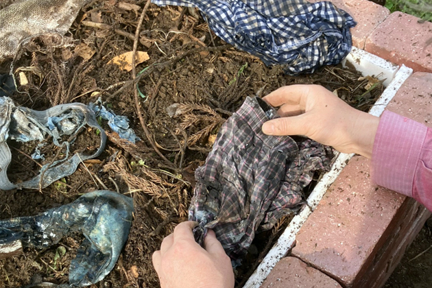 刻まなくても丸めて埋めればOK。落ち葉と一緒にパンツ以外にもシャツやタオルなども菌ちゃんの餌になります。素材は綿や麻やウール100%だけね。1年もすると菌ちゃんが全部食べて、パンツはゴムだけ残りますよ。