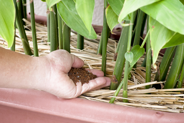 ミョウガの芽が出て葉が立ち上がり、ある程度成長したら、化成肥料でプランター当たり20gほど追肥をします。わらを敷いている場合は、わらの上から肥料をやって大丈夫です。